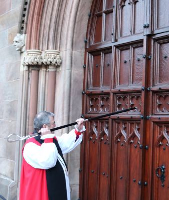 Archbishop John McDowell knocks on the door of St Patricks Cathedral Armagh with his crozier.
