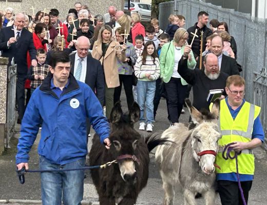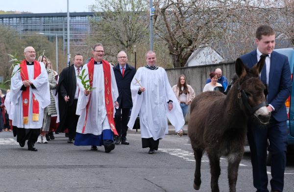 In Enniskillen, the traditional Palm Sunday procession took place from the Cathedral Hall to St. Macartin's Cathedral, led by Tom the donkey.