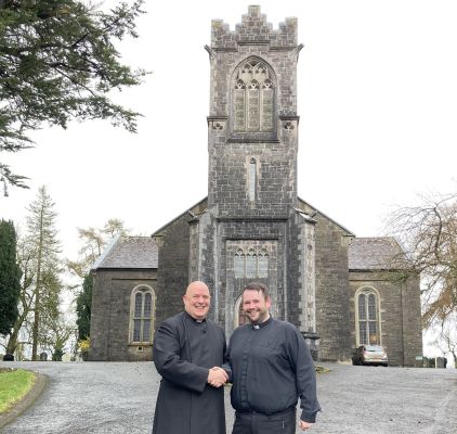 Revd Stephen McWhirter welcomes Revd Mark Gallagher to Rossorry Church after his walk from Trory.