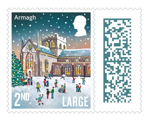 The Dean of Armagh, the Very Revd Shane Forster, said: “I am delighted that Royal Mail has chosen St Patrick’s Church of Ireland Cathedral in Armagh to feature on this year’s Christmas stamps. The image of the light shining out through the Cathedral’s stained-glass windows, along with young people carol singing and playing in the snow, portrays a lovely traditional winter scene.