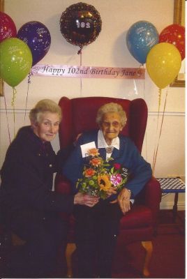 Dr Margaret Knox presenting flowers to Mrs Mary Jane Cathcart on her 102nd birthday