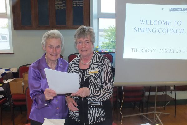 At the end of Council, Valerie Stewart on behalf of the MU members in the Diocese presented Geraldine Beattie with a cheque, as a token of their appreciation for the effort and enthusiasm she had shown during her six years as Diocesan President. Diane Whittaker also added her thanks for all the support and friendship she had received during this time. Geraldine responded appropriately saying how she had enjoyed her time and adding how she had appreciated the support and love she had received during her illness.