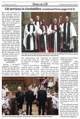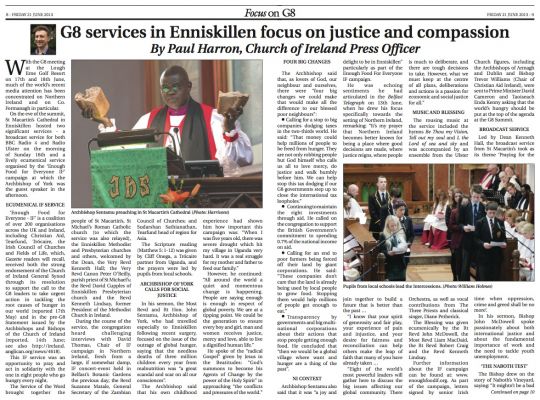 G8 services in Enniskillen focus on justice and compassion by Paul Harron, Church of Ireland Press Officer - as featured in the Church of Ireland Gazette edition of 21st June 2013. Reproduced with permission. For full details about the weekly Gazette, visit www.gazette.ireland.anglican.org