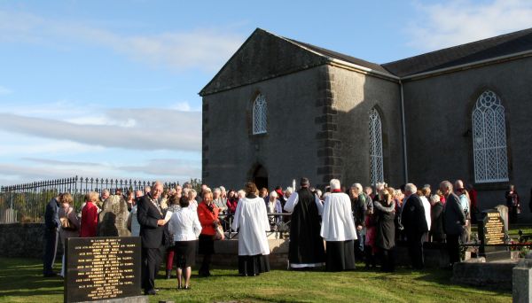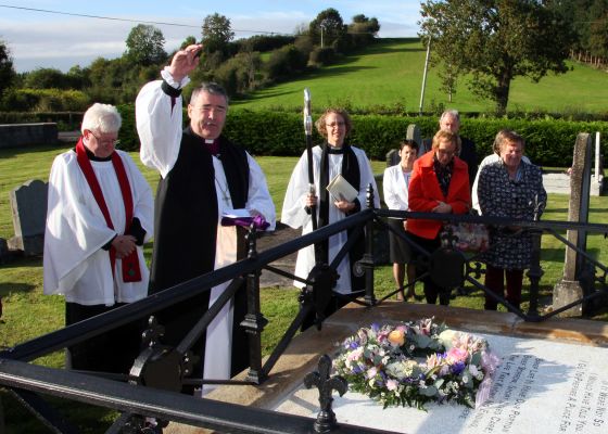 An autumn sun shone brightly on the afternoon of Saturday 12th October as the Bishop presided over the rededication of the grave of the Revd Thomas Hand and his wife Mrs Cassandra Hand at the Holy Trinity Church, Clogh. The church service was led by the Rural Dean of Clones, the Revd Canon Helene Steed, assisted by Capt. David Hamilton. Mr Walter Pringle laid a beautiful wreath of Victorian flowers on the grave. Local residents, community representatives and dignitaries came together to celebrate the life and work of Cassandra Hand (1809-1868) and her contribution to the famine relief in Clones and the surrounding area. Cassandra's legacy lives on today with many women carrying on the lace making craft handed down through generations.
