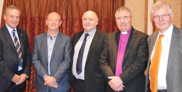 Photo (L to R): Mr Stuart Brooker (Grand Master of Co Fermanagh Grand Orange Lodge), Rev Doug Baker, Mr Paul McFadden, Bishop John McDowell, Prof Roddy Cowie)