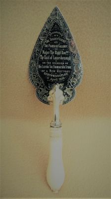 'The Newtownbutler trowel was presented to the Earl of Lanesborough(surname Butler) after laying the foundation stone of the rectory in Newtownbutler on April 11 1914. This solid silver trowel with all the silver hall marks was made by Hilliard and Thomason in 1883 in Birmingham. The handle is either ivory or bone.